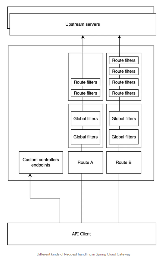 ● Route Filters: Route filters are specific to a particular route and are applied only to requests that match the defined route. They allow for customization and transformation of requests. Route filters can receive different configurations for each route. Imagine a AddRequestHeader filter that appends a header for each request before sending it to the upstream server, we can add headers with a different names and values for each route.