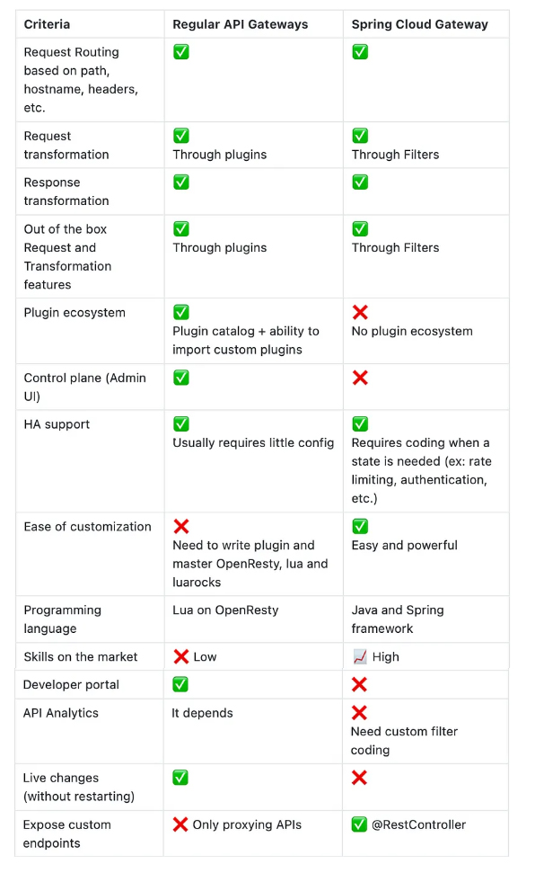 ● Easier setup for HA: Regular API Gateways are easier to deploy in Active-Active mode. Doing this in Spring Cloud Gateway requires more effort since we need to deal with Spring configurations to enable Redis or an equivalent tool to support multi instance synchronization.