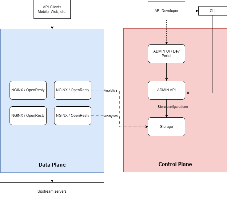 The Data Plane is based on OpenResty/Nginx gateways serving APIs to clients and forwarding requests to upstream servers. The Data plane is configured by a control plane that describes the APIs and specifies which processing is done at each API and which plugins are applied per route.